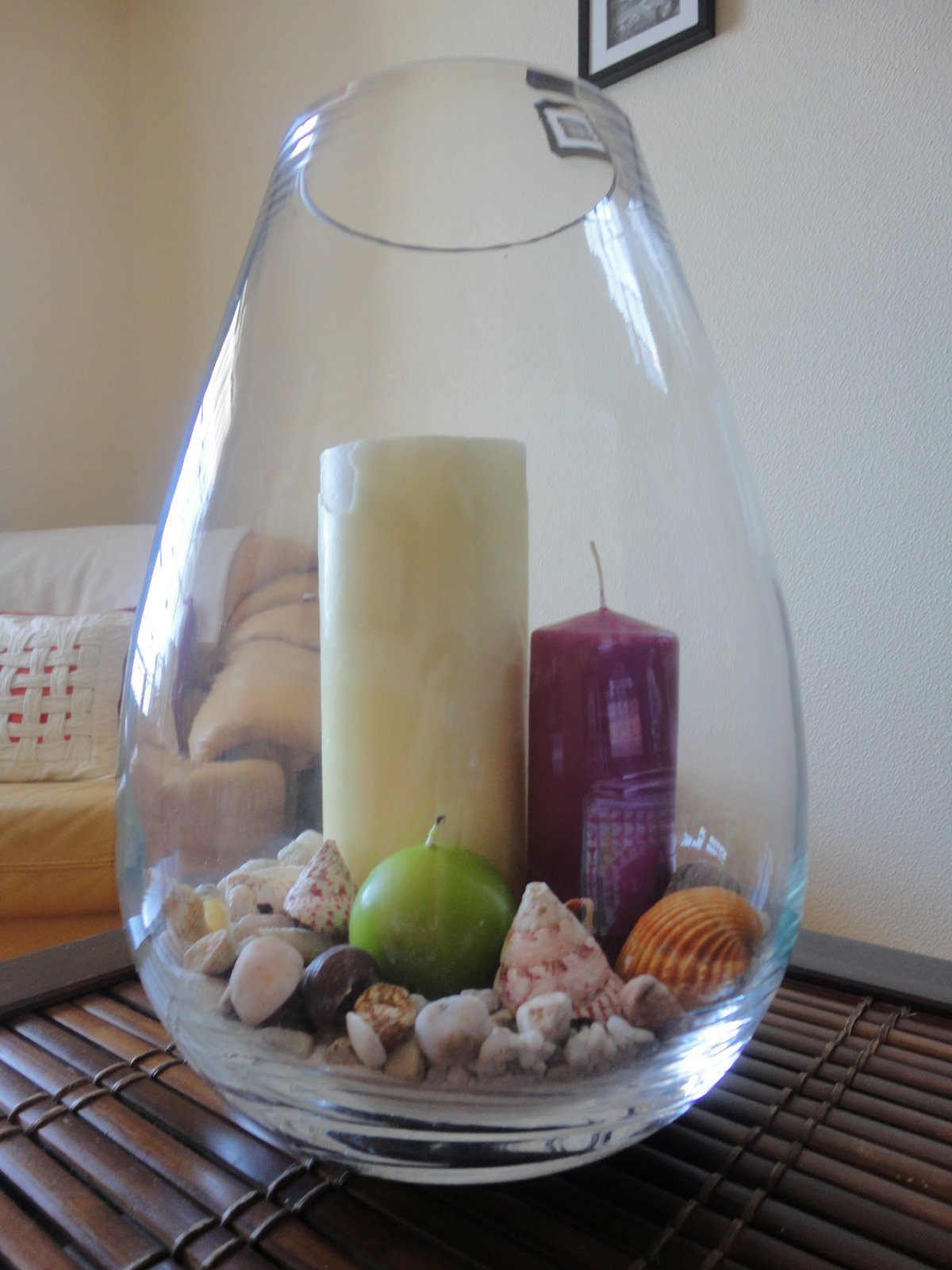 Tenho este jarrão" multifunções" com um pouco de areia , conchas e pedras da praia e umas velas ficou assim