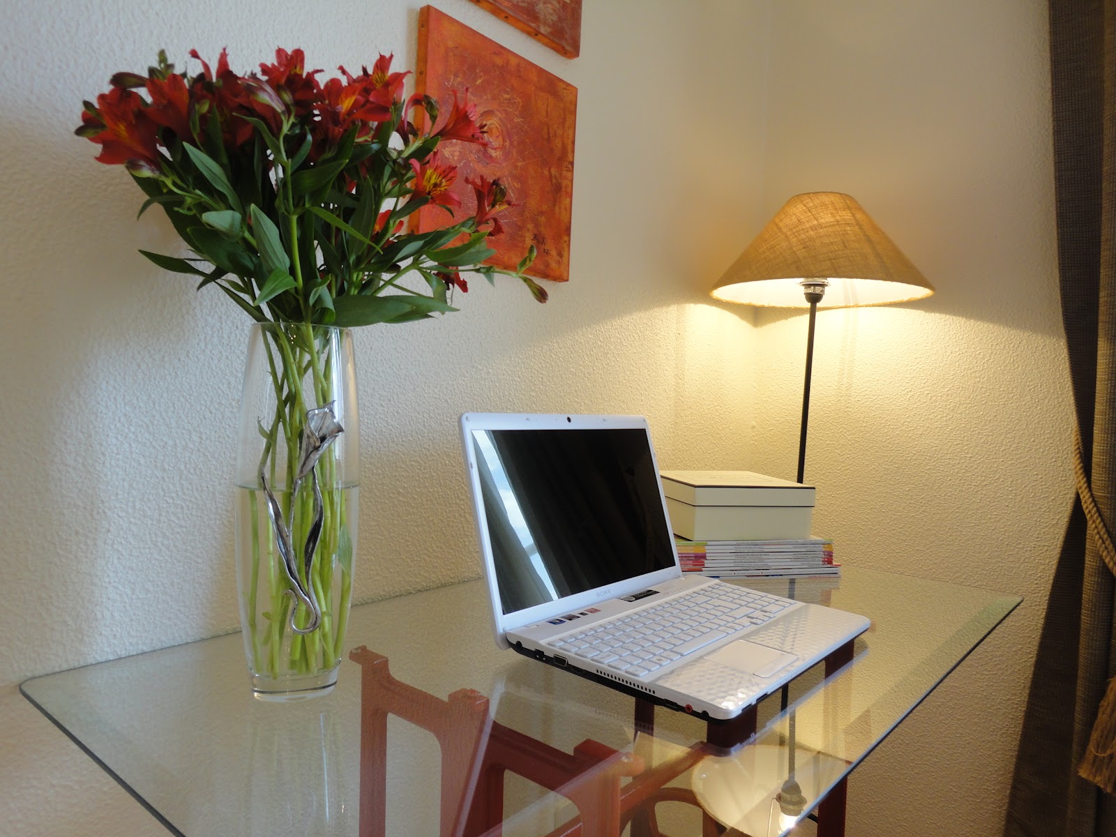 Queria algo original e que se integra se bem com a decoração da nossa sala .Resolvemos fazer então uma secretária colocando um tampo em vidro .